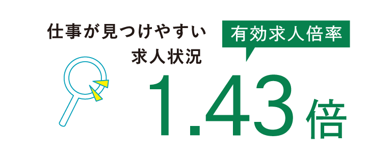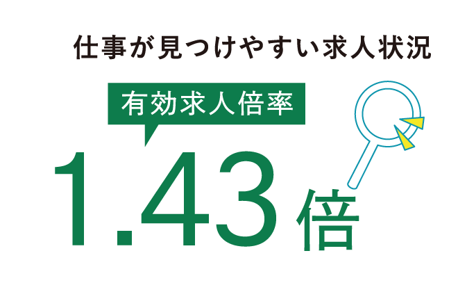 有効求人倍率は1.43倍、全国平均1.26倍を大きく上回る「売り手市場」の状況。これは、仕事が見つかりやすい環境であることを示しています。